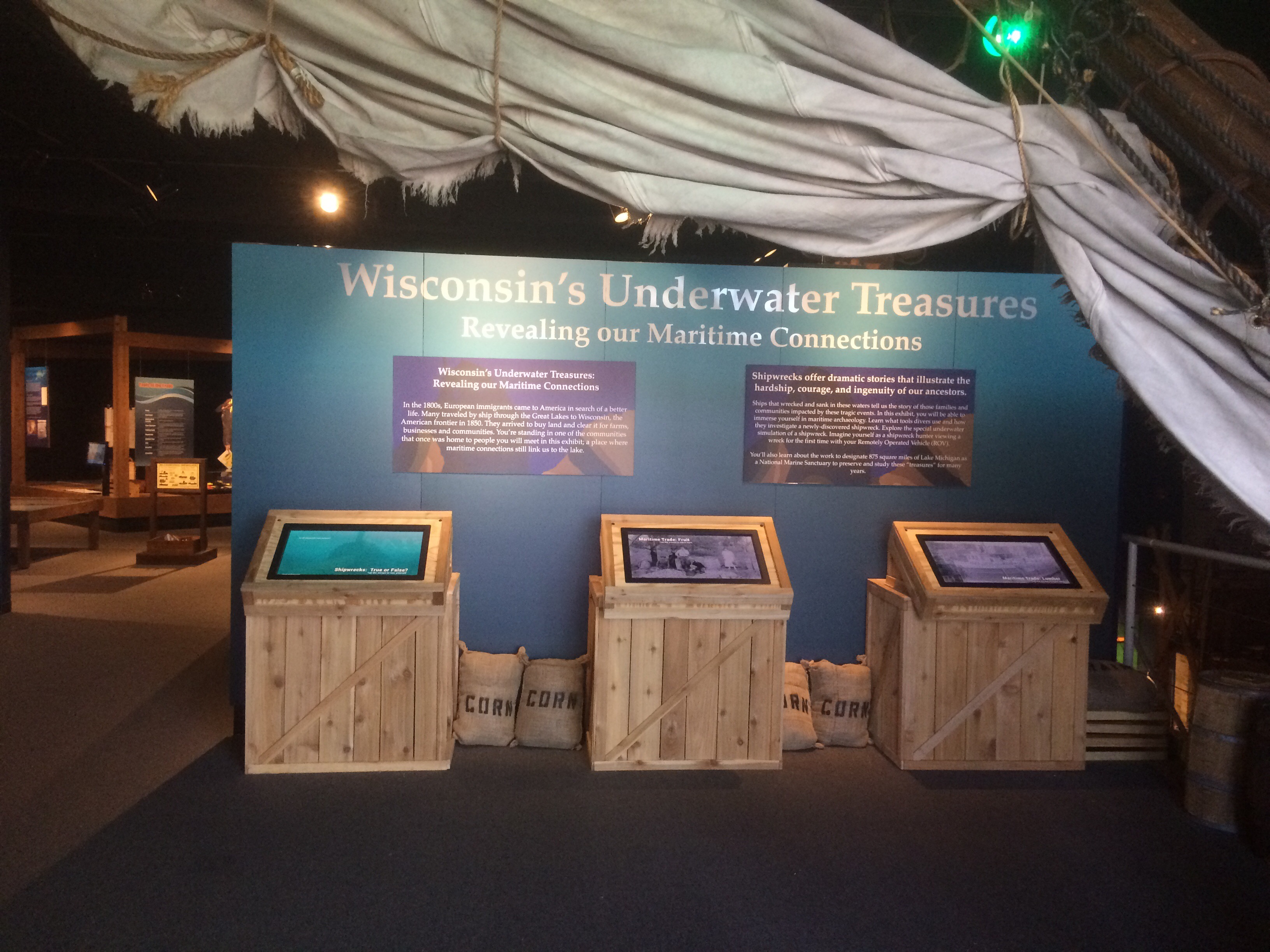 I follow a flight of stairs, as I descend I’m charmed by a mid 19th century downtown setting. Replica store fronts and a skeletal portion of a hull of a ship lay before me. Here the exhibits become even more interesting. The lighting remains the same as I find myself in a large room full of all things maritime. As I read placards on the walls I realize a maritime museum in Manitowoc seems a natural and rational choice.