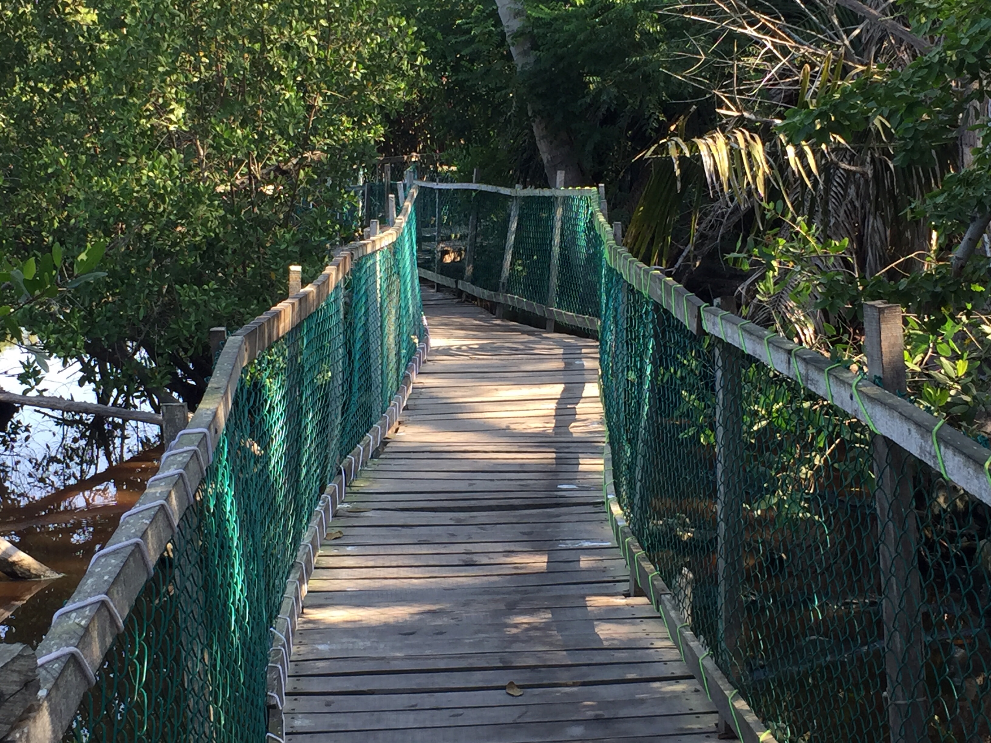 The weathered wood path weaves its way through the brush of the mangrove, where the trees sometimes serve as an emerald canopy. Beneath us the murky water holds danger, as we know the Crocs lie in wait for their next meal. When we reach a rickety tower and climb, surveying the landscape of the saltwater growth, we watch the reptiles operate in their natural habitat.