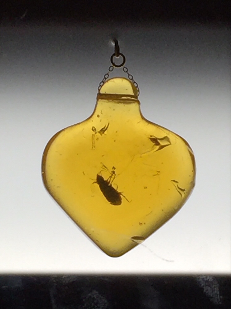I am left to wander a hall whose walls hold mildly interesting exhibits. It is here, in a small room, that I discover something I’ve always fancied viewing in person. It may seem rather mundane, however, like many of my generation- I love Jurassic Park. Insects trapped and preserved in amber beg the question, “Could we really reconstruct a prehistoric animal?” I marvel at an extinct bug, forever giving testimony of its existence, in a crafted piece of jewelry.