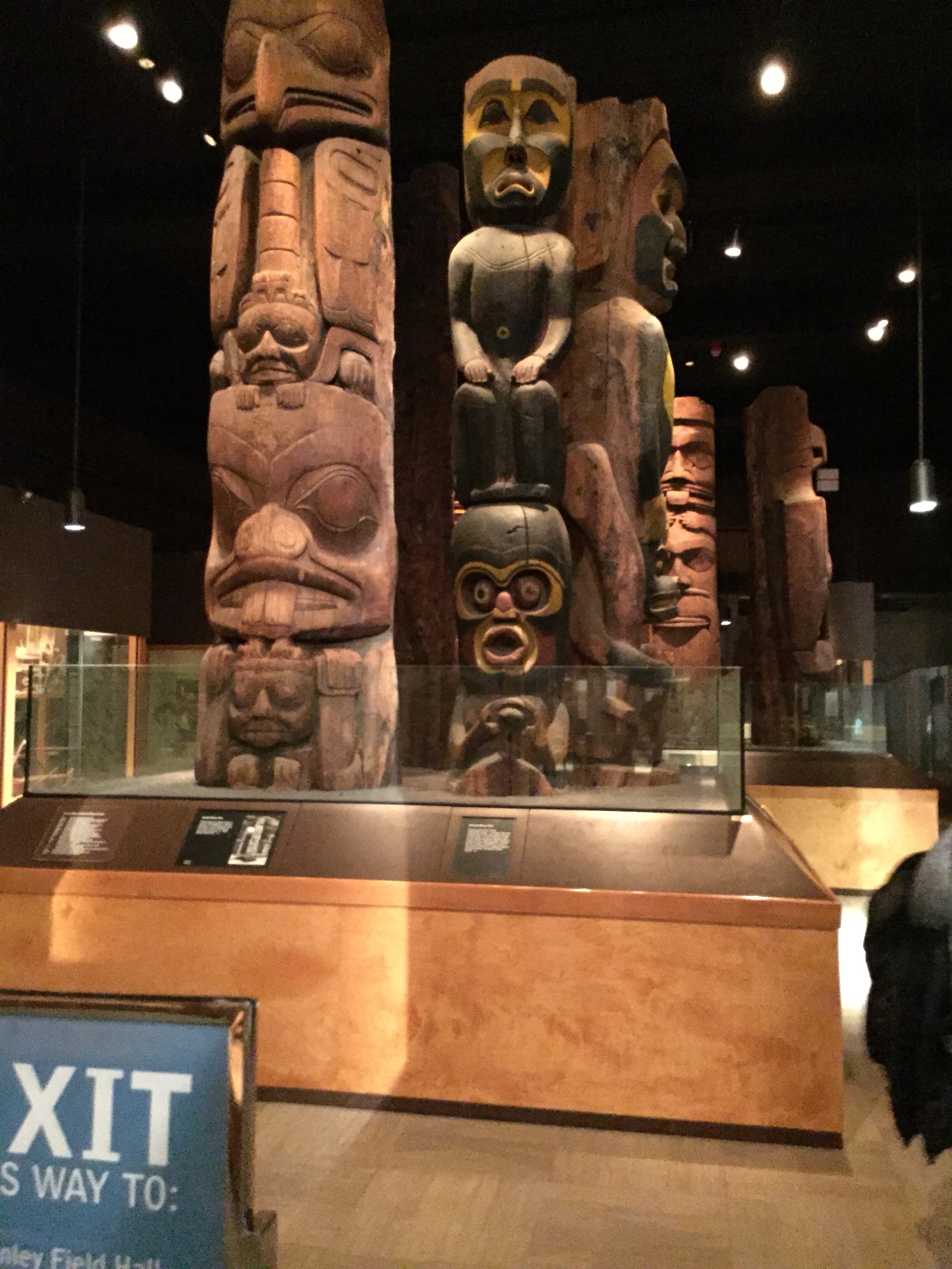 Looming in one of the many halls, totem poles, created by early inhabitants of the northwest, dwarf awestruck visitors. The giant timbers decorated with imaginative beasts and, what appear to be, demons send a thrill through me. Of course there are weapons, tools, musical instruments and clothing on display from the many lost cultures of the conquered Americas.
