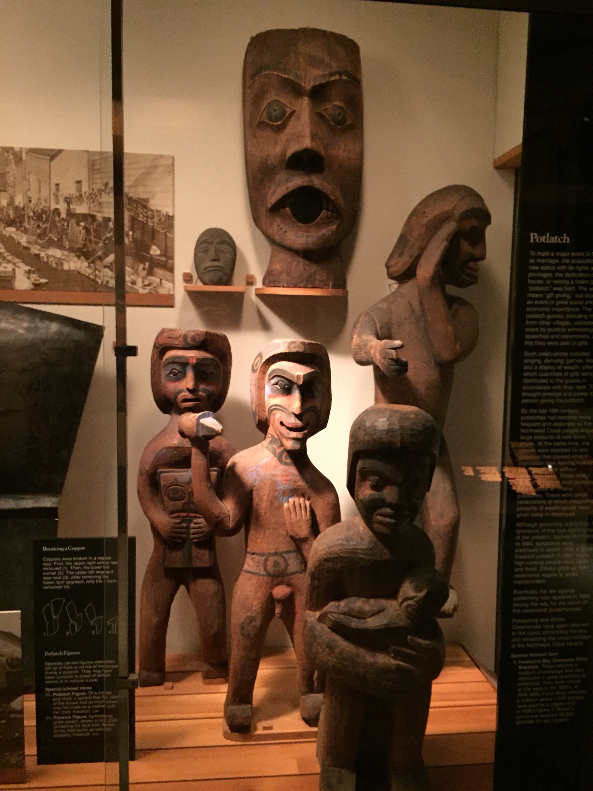 Looming in one of the many halls, totem poles, created by early inhabitants of the northwest, dwarf awestruck visitors. The giant timbers decorated with imaginative beasts and, what appear to be, demons send a thrill through me. Of course there are weapons, tools, musical instruments and clothing on display from the many lost cultures of the conquered Americas.