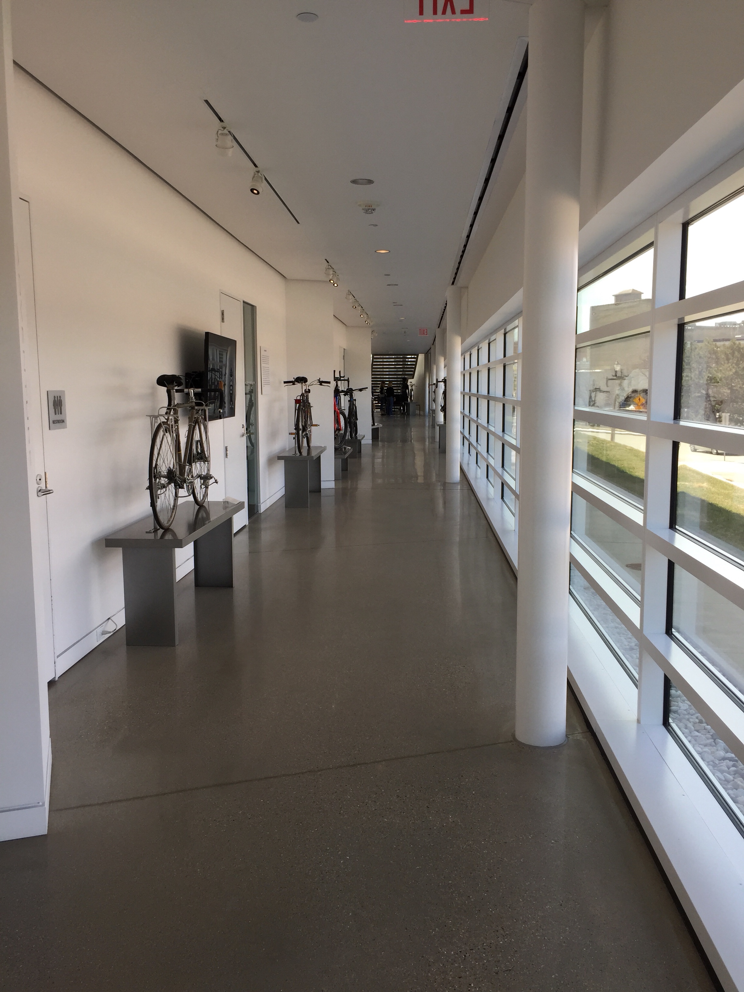 We thank the woman for her hospitality and follow a hall. Sunlight filters through glass panels, falling upon bicycles and a backdrop of white. Many interesting and significant bikes are lined against the walls in this long and narrow walk. There is a winner of the Tour de France, a world speed record breaker and a bike once owned by the late celebrity Robin Williams. Not to mention, off road racers are also presented in this procession, with dirt from the races plastered on the pedals, spokes and frame.