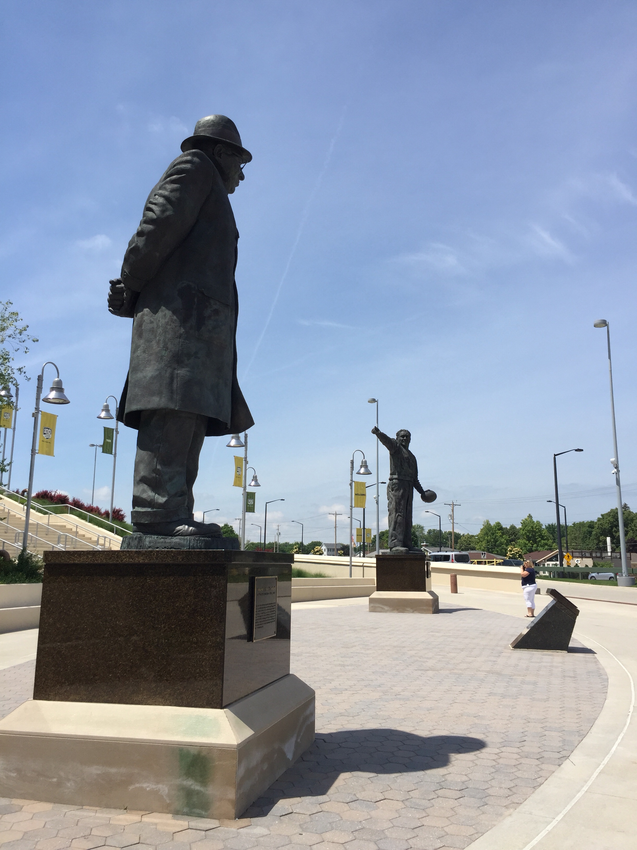 The stadium parking lots are buzzing with activity. I enter the lot casually and snap a photo of statues representing two of the most iconic men, not only in Packer lore, but the NFL itself. One of the statues is Curly Lambeau, the player, coach and founder of the franchise. The second is Vince Lombardi who assembled and coached teams that won five championships in seven years, including the first two Super Bowls. They stand guard at a flight of concrete stairs, ascending towards a gate facing Lombardi Avenue. I’m not the only one hoping to get a great picture of these detailed depictions.