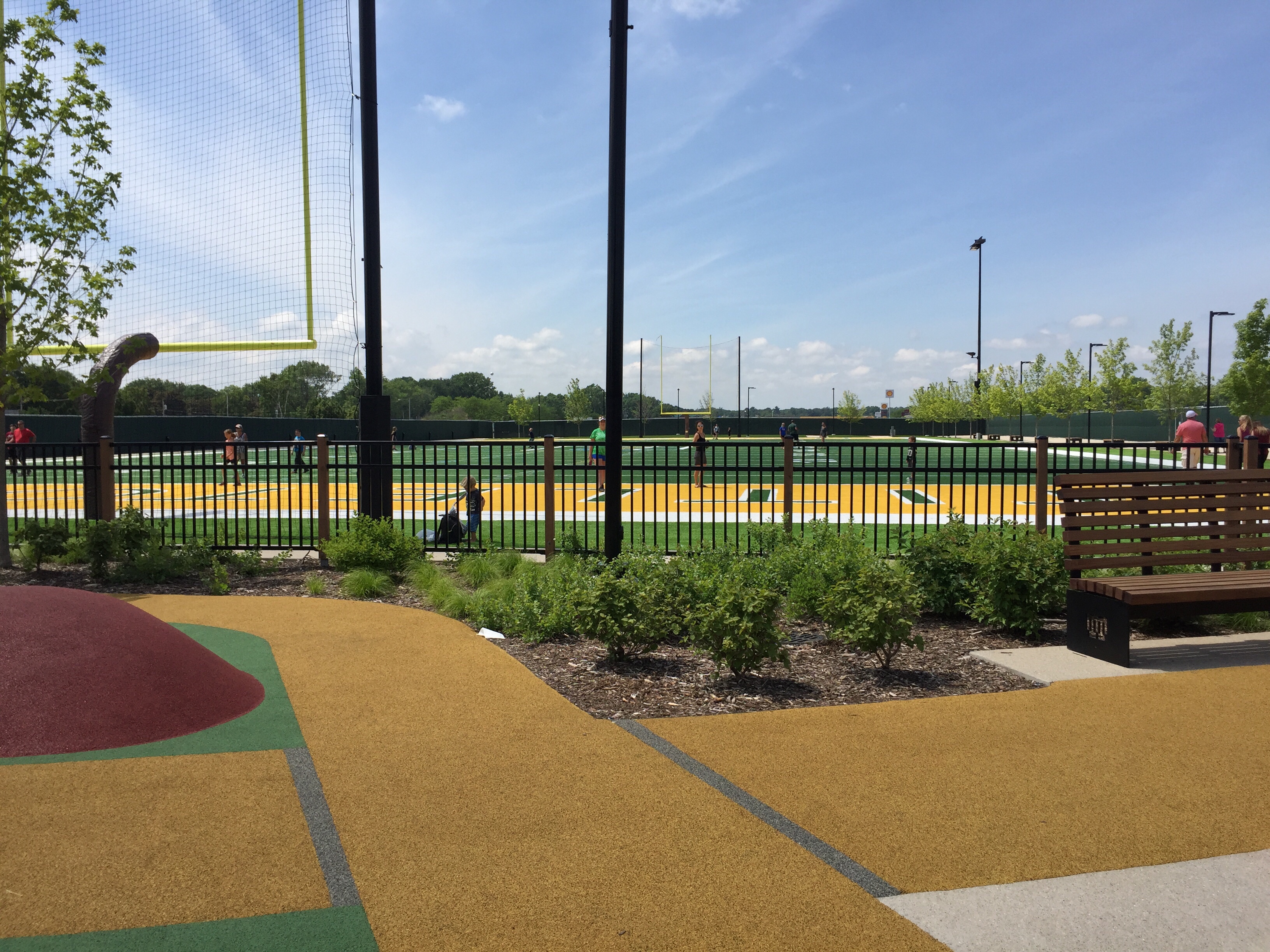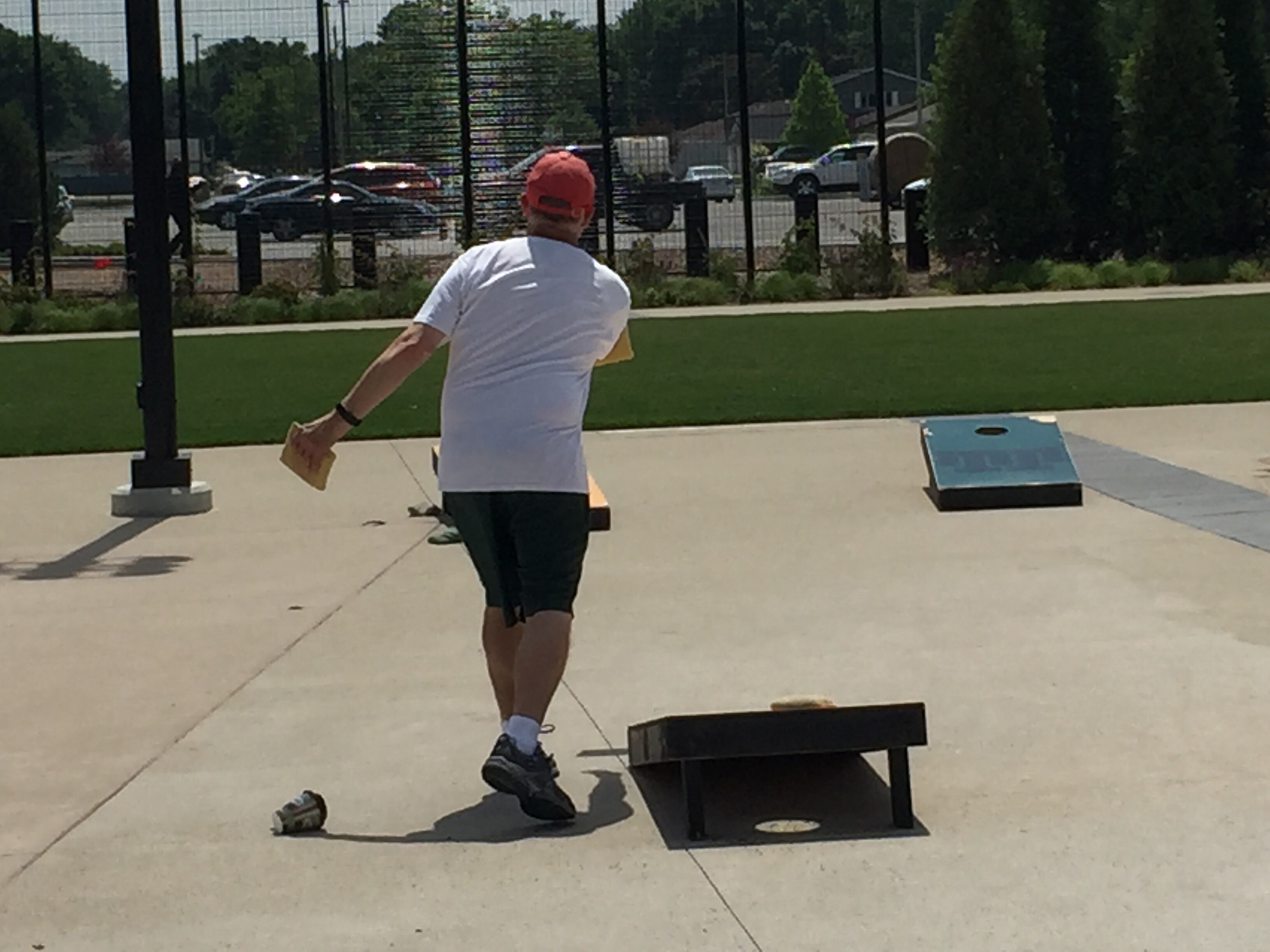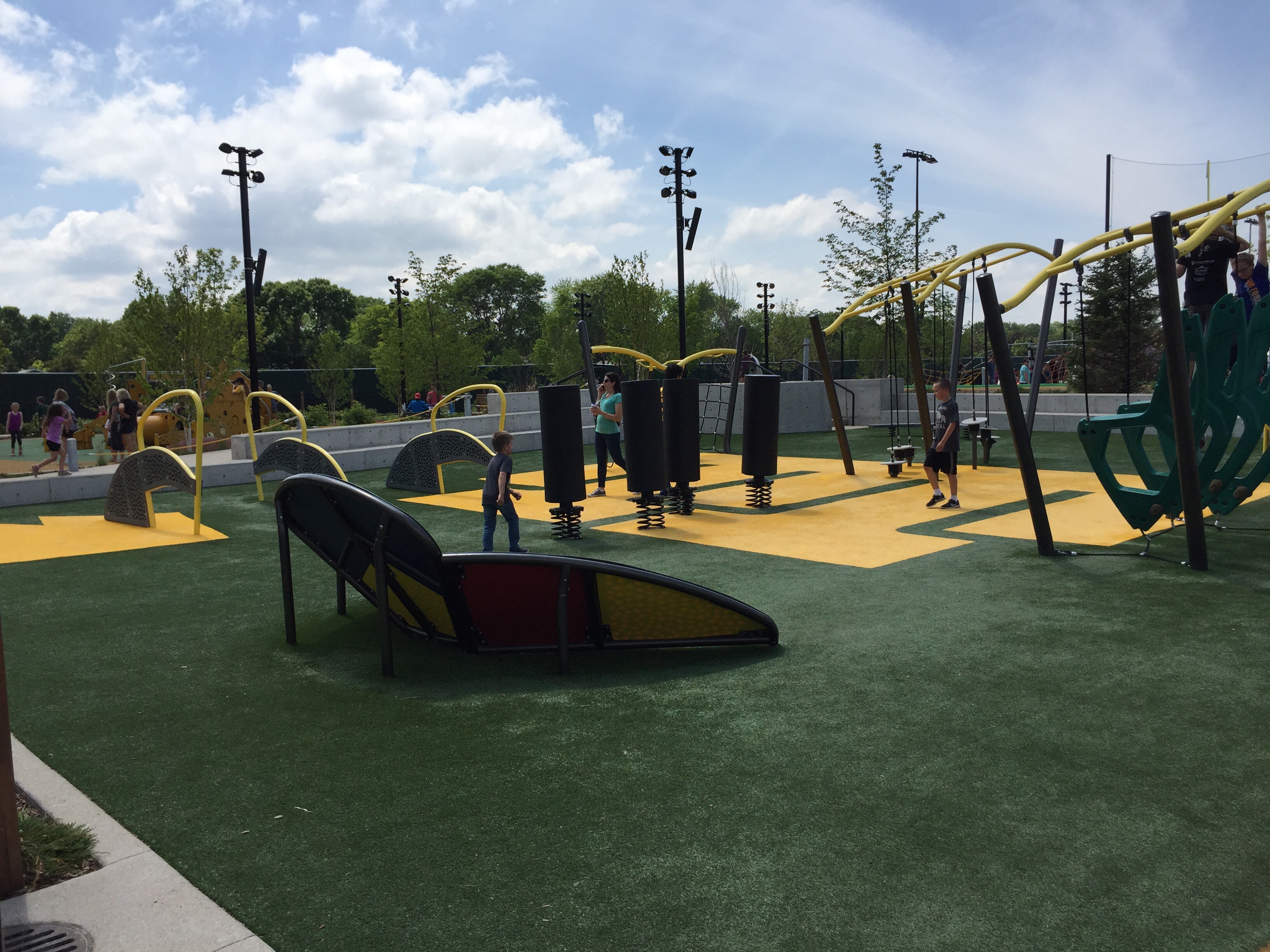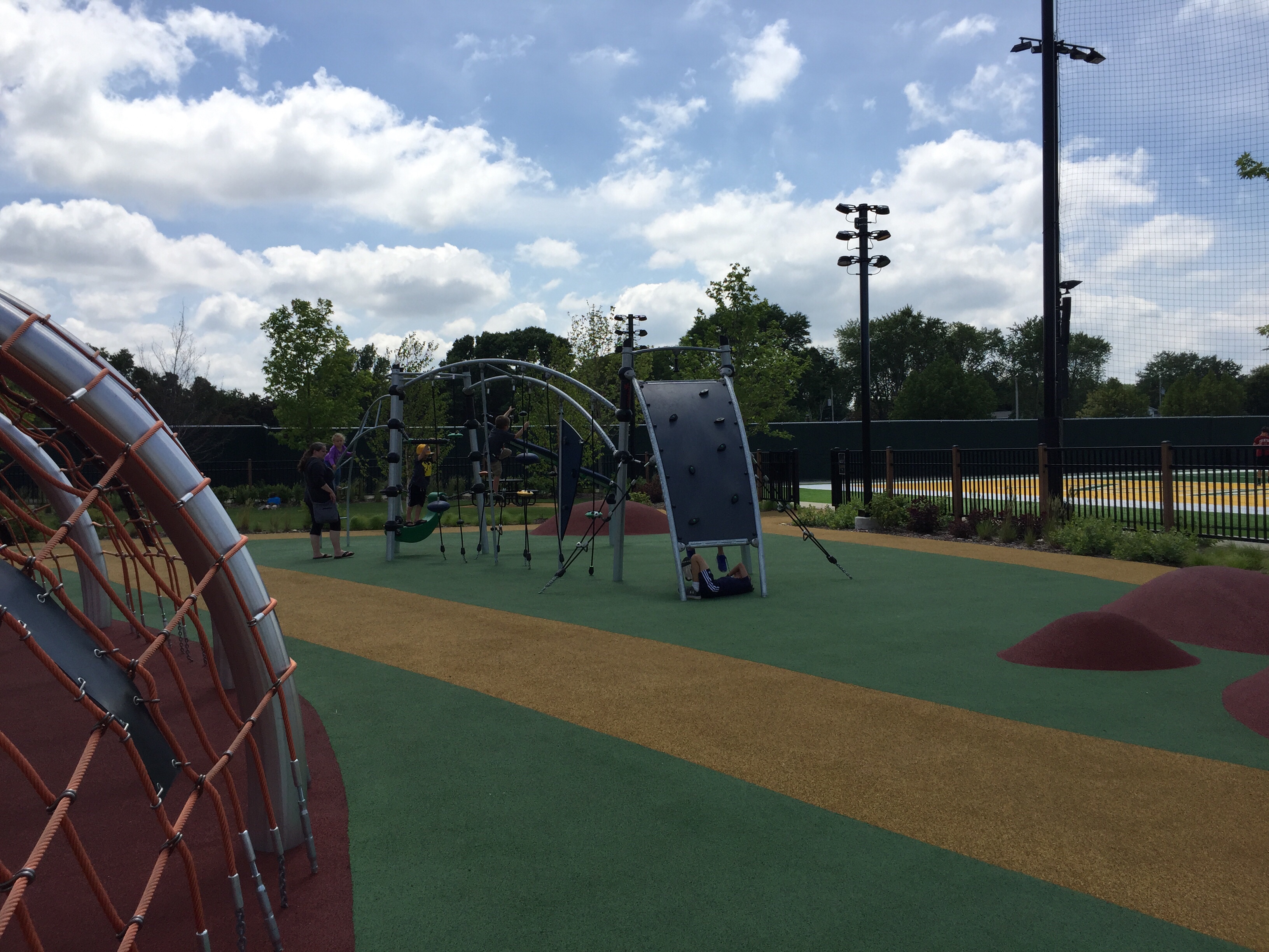 Today, I’m staring at different types of fun. Yard games, from shuffleboard to bean bag toss, are set up on the grounds. Also, there is an elaborate playground, the apparatus for kids play in this park blows my mind-we only had a jungle gym dangerously constructed with steel pipes when I was young. To top off the activity center right, a full length football field, complete with goalposts, stretches beyond the play area.