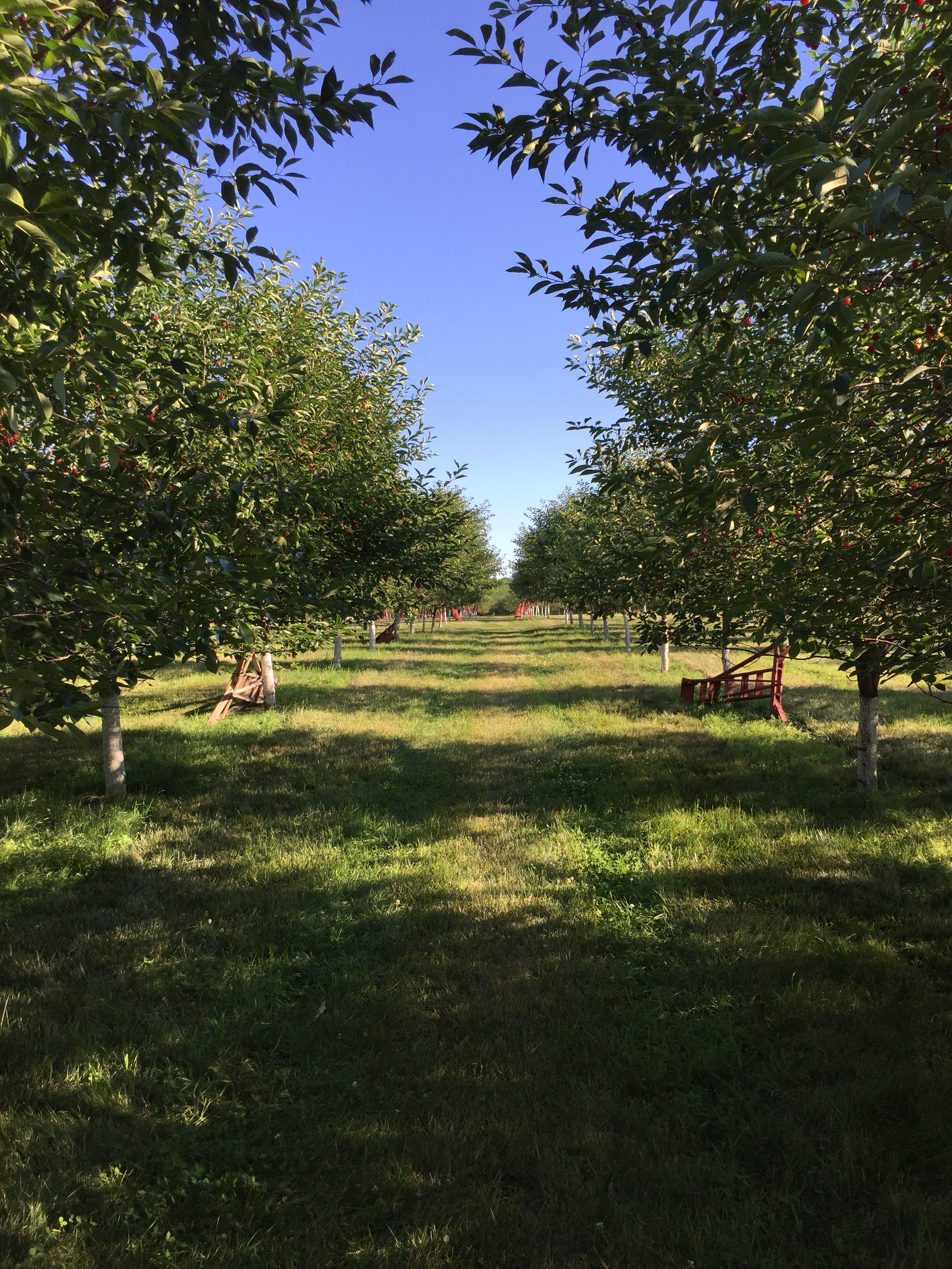 We’ve just started down Highway 42, heading north from Forestville. I spy the sign for Cherry Lanes and am disappointed. It’s closed. We had a late start from Green Bay and its now 6, as the venue closed at five. I figure we’d drive in the orchard anyways and see if anyone was around.