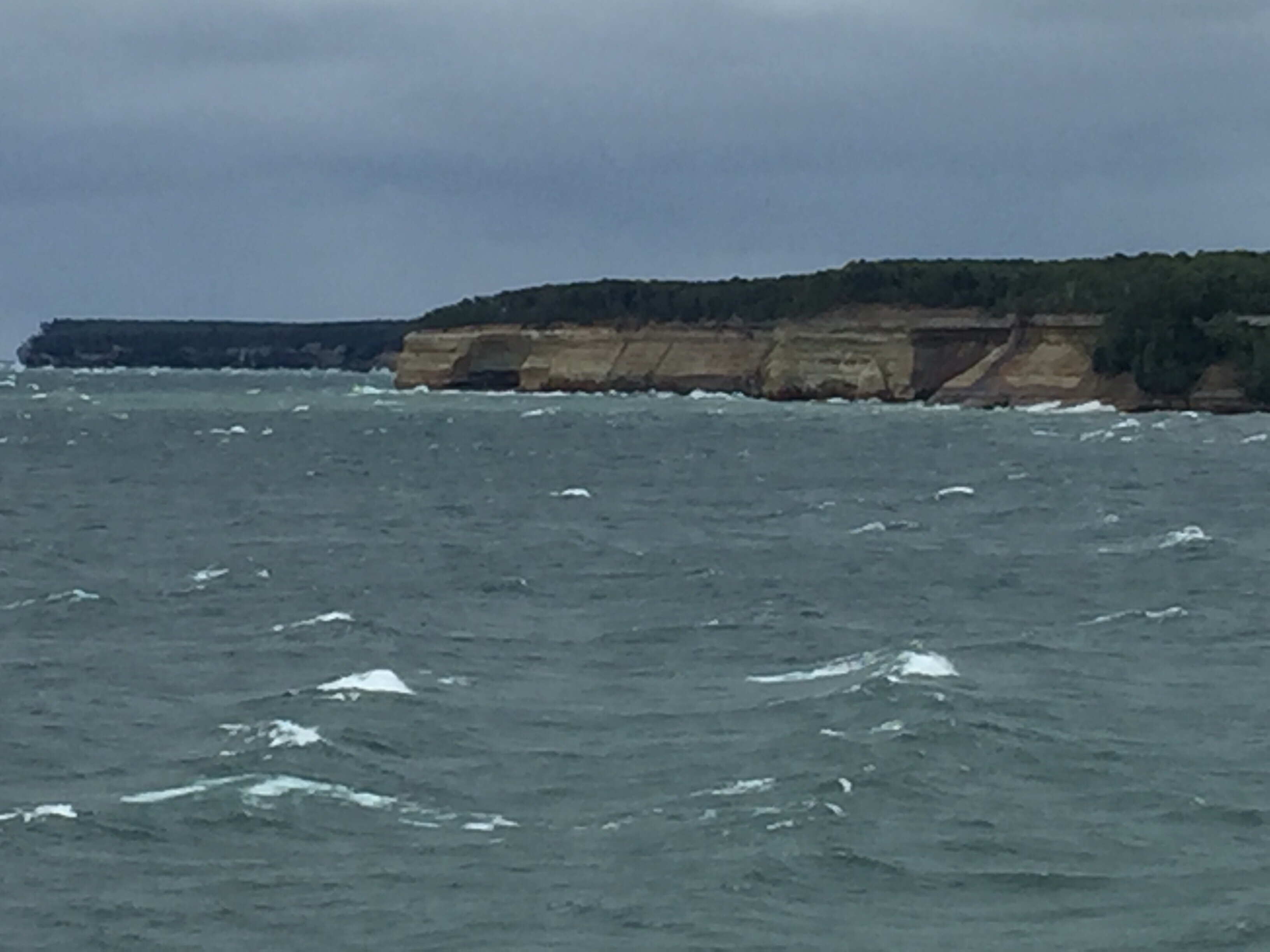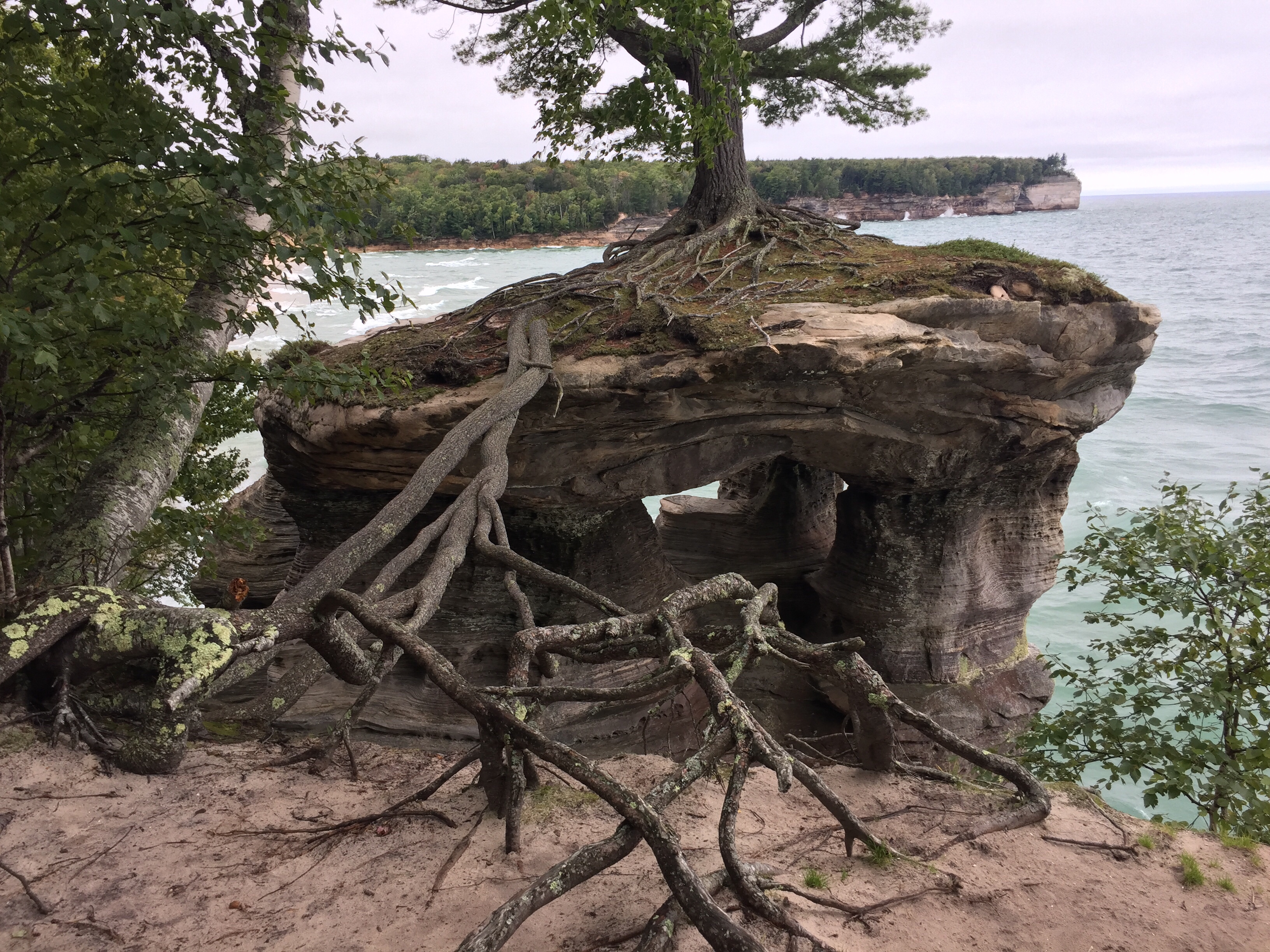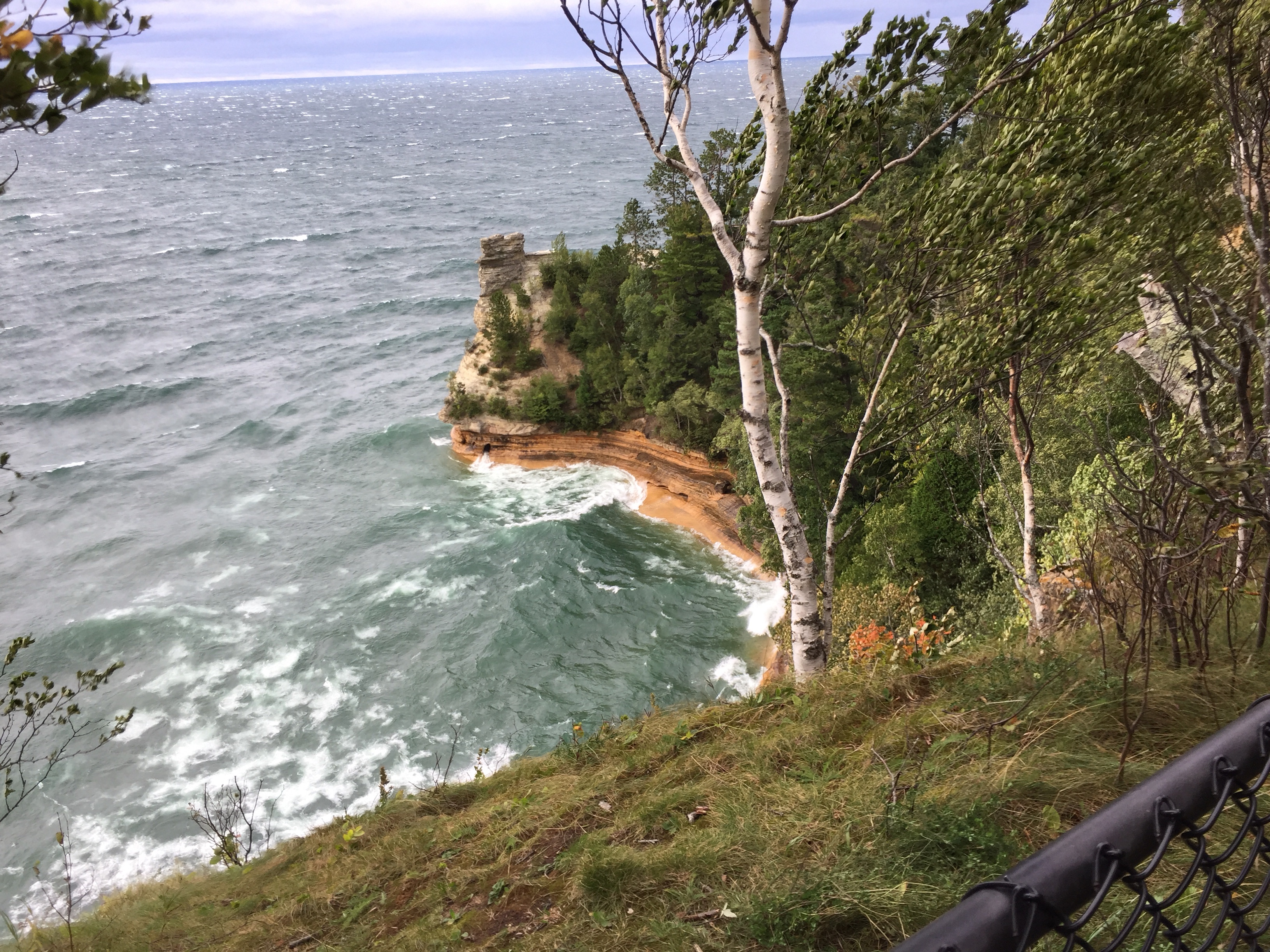 After the trail, we hop back in the car, following the winding side road to its end. Standing inviting in a very modern fashion, an elaborate platform, complete with vending machines and restrooms, greets us. As the wind is unbelievably wicked today, I use care while clutching my iPhone over the structure’s ledges. The result are these photos of the Pictured Rocks shoreline and a sandstone rock formation, known as Miners Castle.