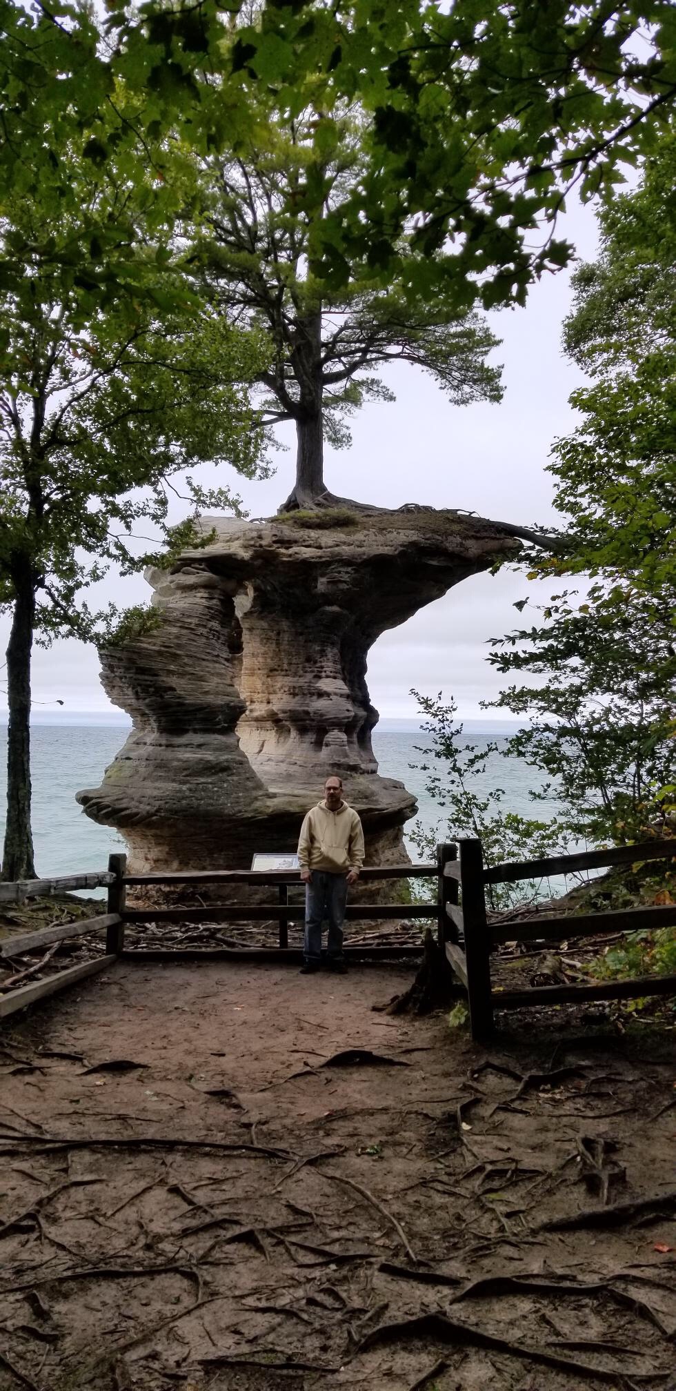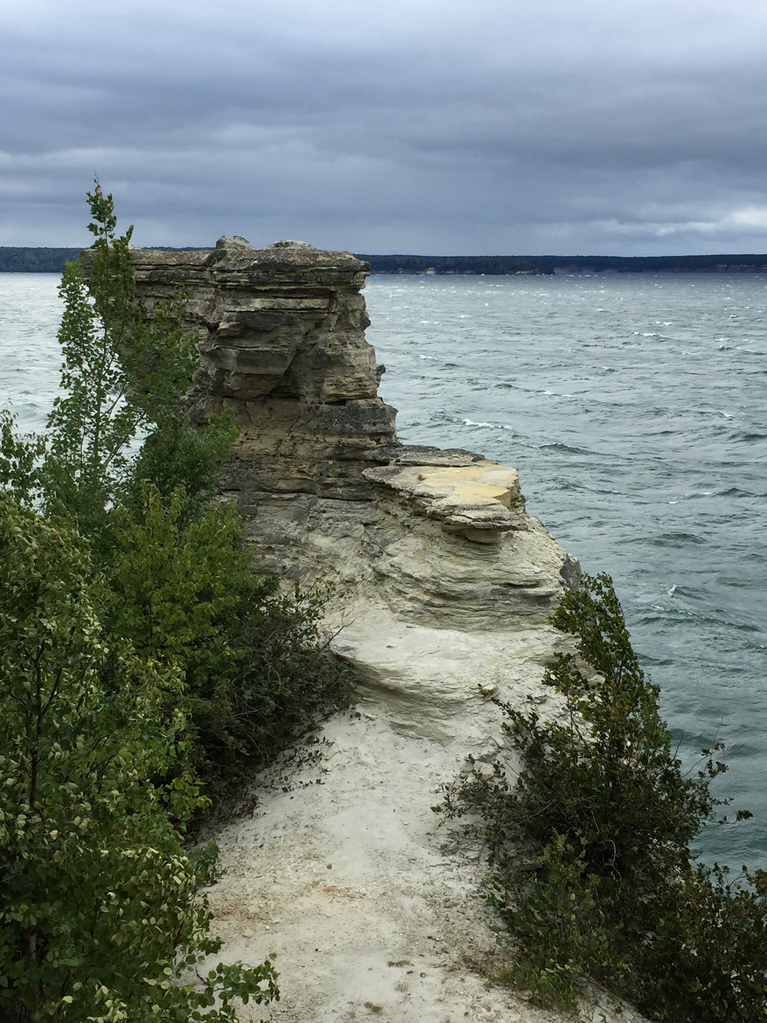 After the trail, we hop back in the car, following the winding side road to its end. Standing inviting in a very modern fashion, an elaborate platform, complete with vending machines and restrooms, greets us. As the wind is unbelievably wicked today, I use care while clutching my iPhone over the structure’s ledges. The result are these photos of the Pictured Rocks shoreline and a sandstone rock formation, known as Miners Castle.