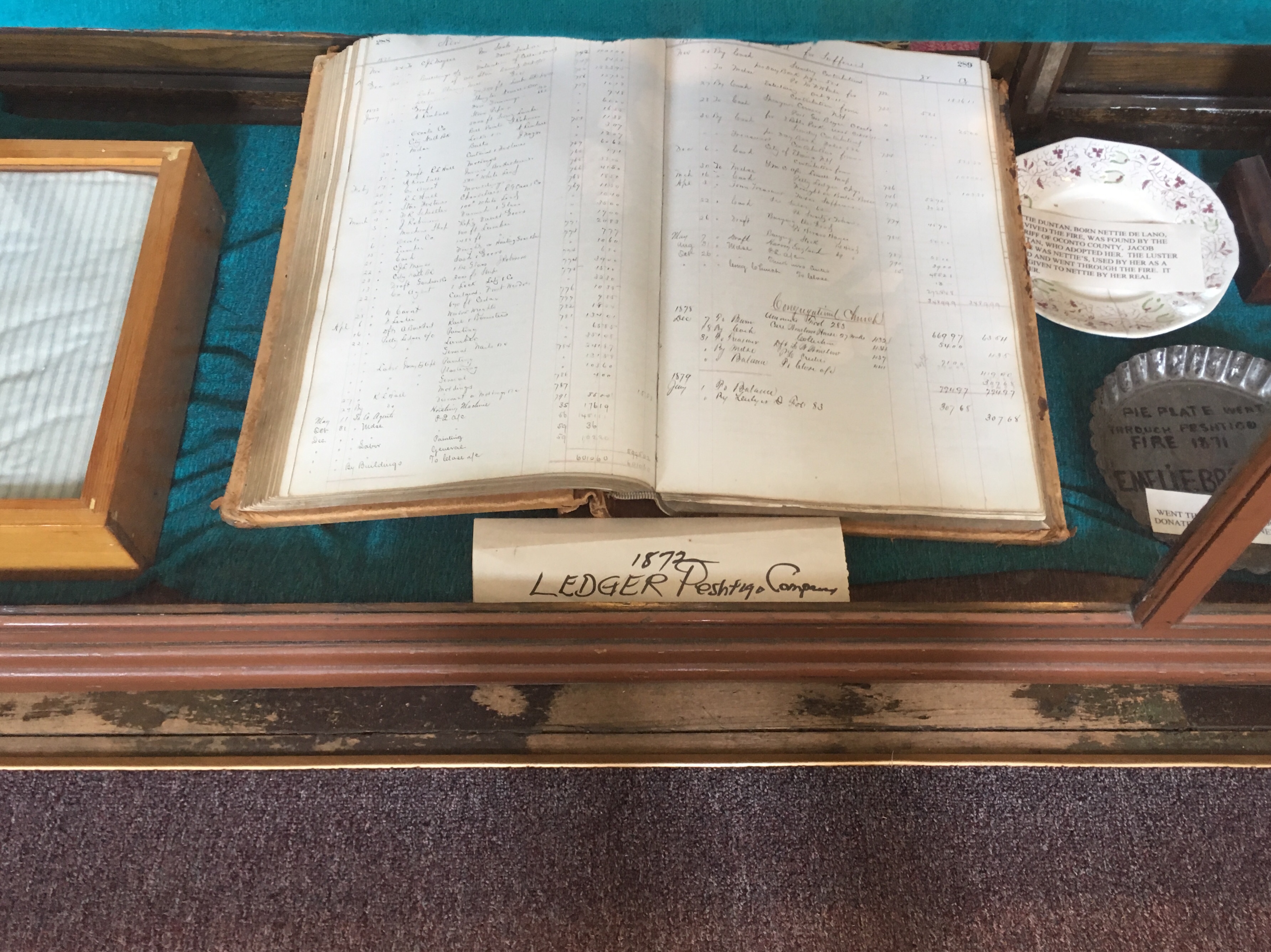 I inspect the case first, after all, that is why I came here. Among some rather rudimentary artifacts is this ledger which is well preserved. It belonged to a businessman who owned most of Peshtigo at the time. The ledger was recovered from his vault after the fire. I inquire if the man survived the disaster, to which I received the most Ironic of answers. “He was in Chicago at the time.” I chuckle. I’m assuming he survived that fire also.