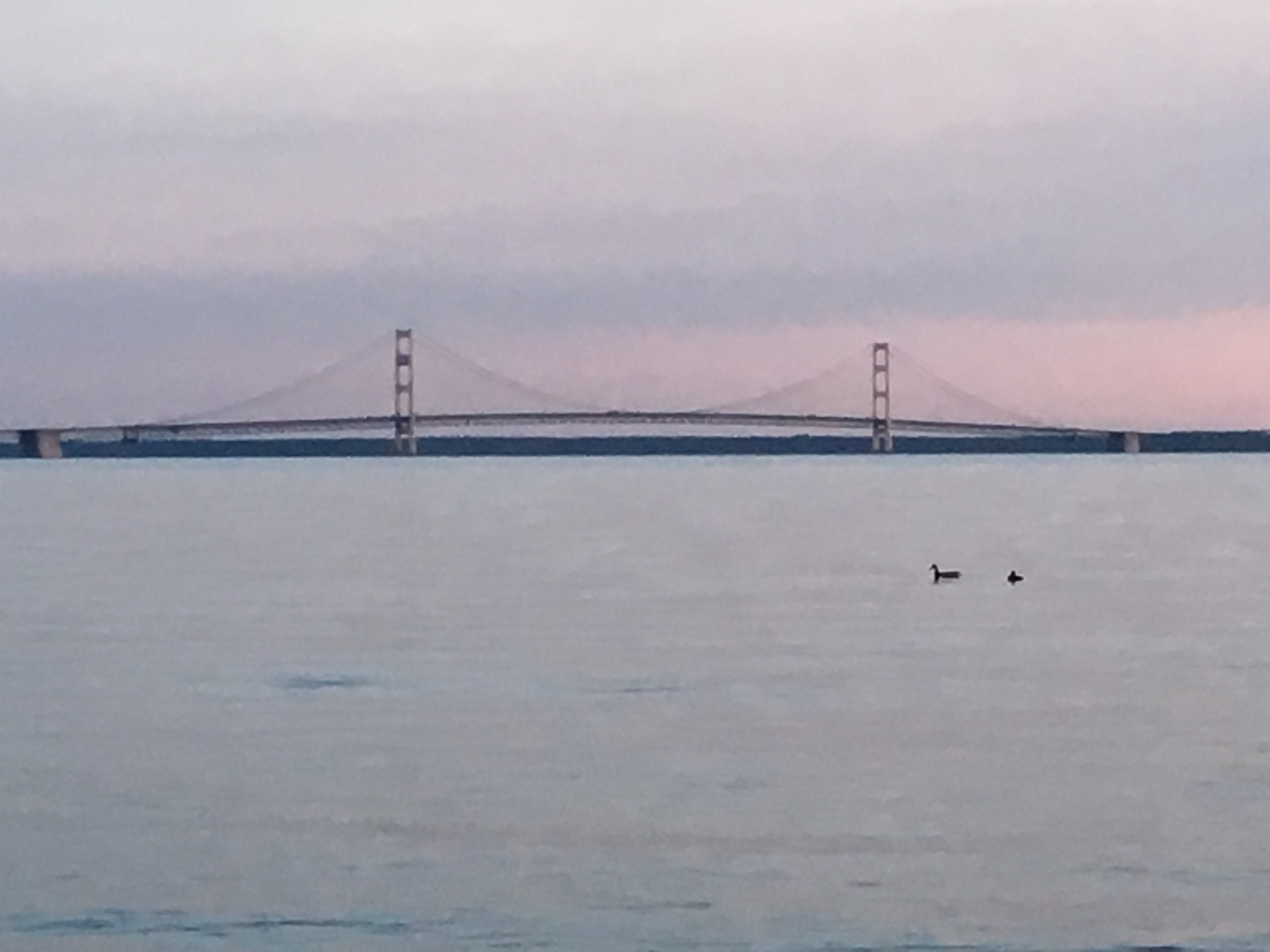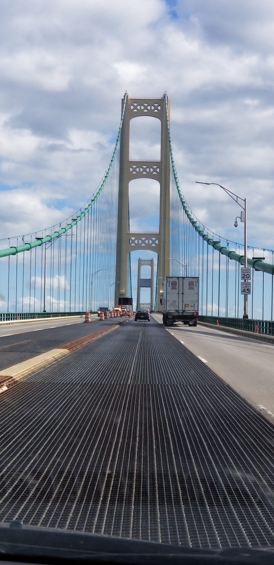We’re almost at the Mackinac and discover there is a toll for crossing. The four dollars may seem excessive, but considering that it cost almost 1 billion dollars to erect in 1957 it’s understandable. I can only guess what the expenses of the upkeep are. The fact that road crews are working on it today vies for the cost and also makes me feel safer.