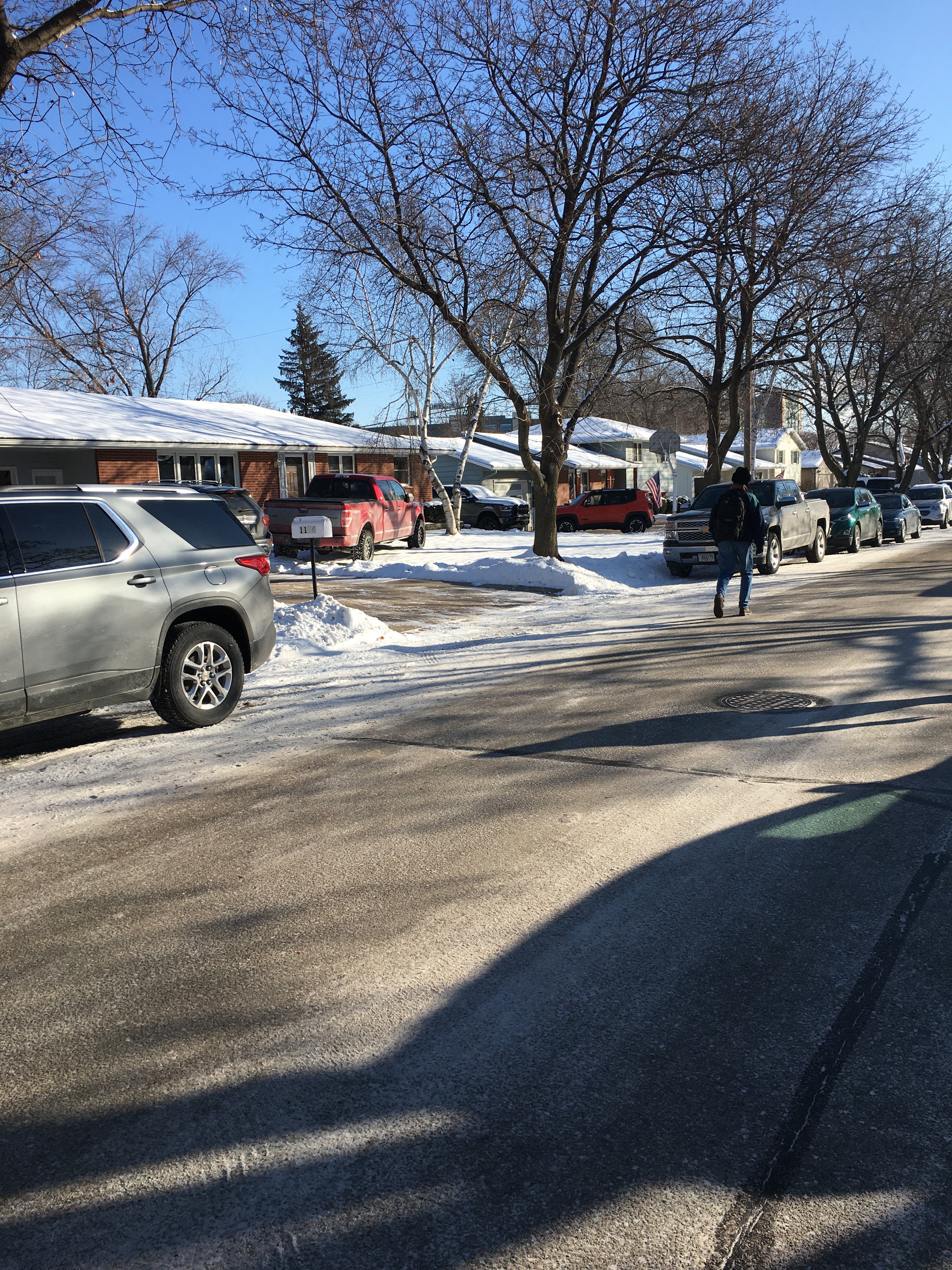 We’re driving through a neighborhood in Ashwabenon, Wisconsin, searching for a place to park. It’s still early and, believe it or not, I easily find a spot free of charge right on the street. Heidi’s asking why I didn’t park closer, but the walk to the stadium isn’t that bad. Plus, it doesn’t matter how fast we get to our car, we’re sure to be stuck in traffic after the game, albeit a car is warmer than a long walk in the cold.