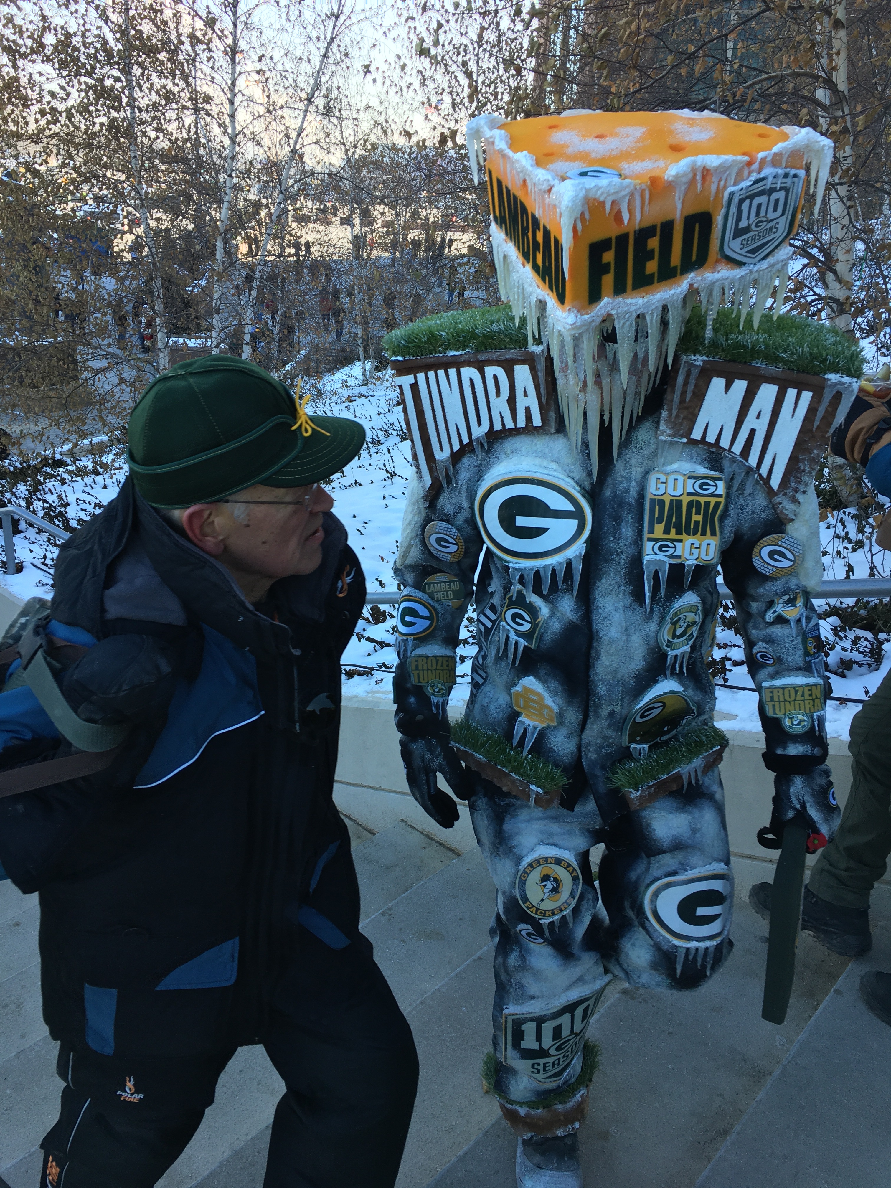 After a short stroll through this neighborhood, above the rooftops, Lambeau Field comes into view. I can see the Packer logo emblazoned high atop the Stadium’s façade. Along with the sight, I smell the distinct scent of burning charcoal stealing the crisp clean air. As its smoke emanates from a nearby grill at Kroll’s West, People are mingling and starting their day off with a beer. I hit the porta-potty and enjoy the atmosphere for a bit. Fans are dancing, laughing and chanting that montra meant to be taken lightly-“The Bears Still Suck!”