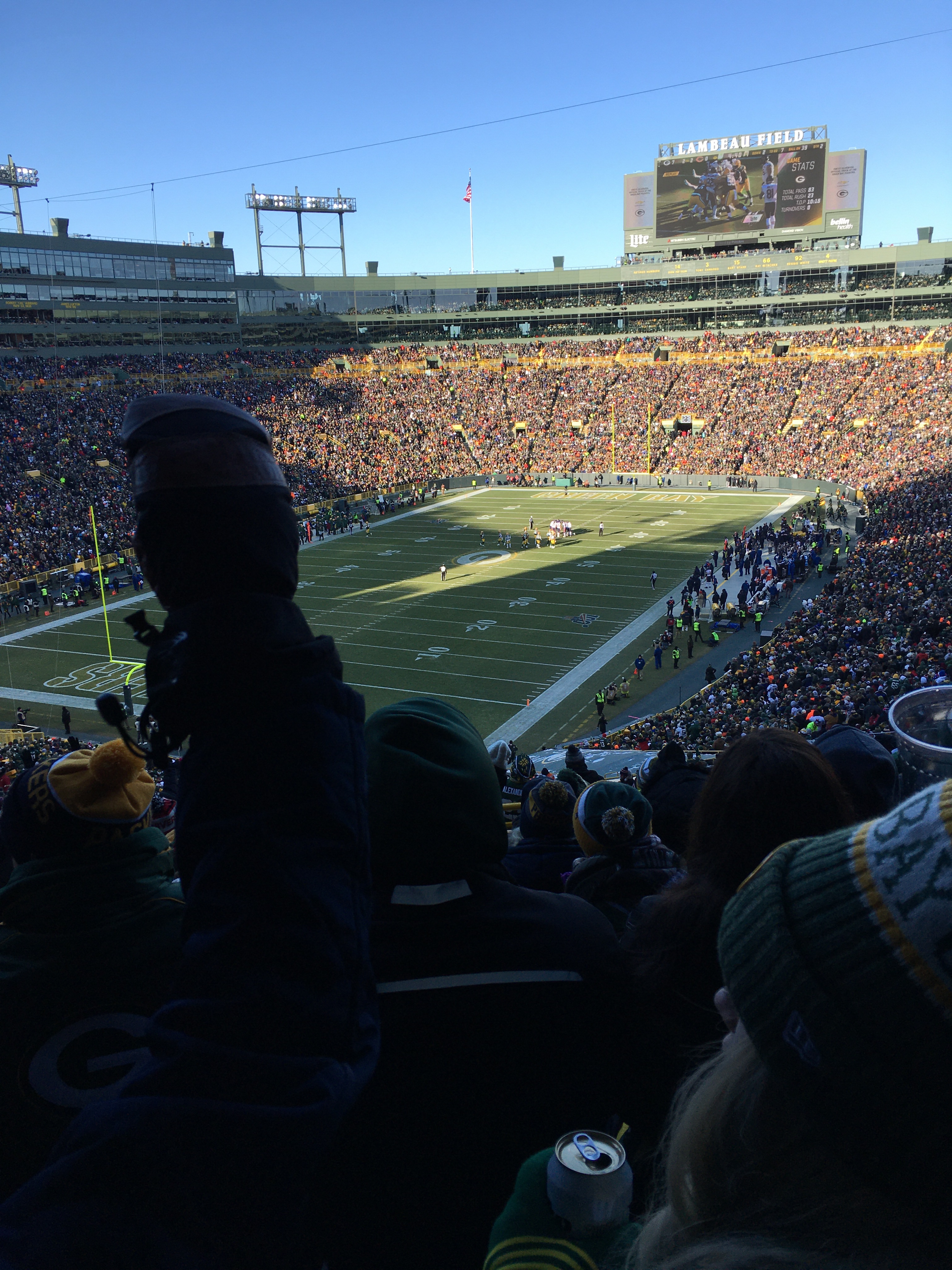 I zip up and make my way to the stands right before the second half kick-off. Apparently the Packers offense made some adjustments during half-time. The third quarter is the best part of the game for the Green Bay faithful, as the Packers extend their lead to 21-3. Right now, I’m enjoying how the announcer engages with the onlookers as he, along with videos on the Jumbo-Trons, urges fans to get up and make noise at key moments during the game. He also sends a shh towards the fans while the offense takes the field, so the entire team can hear our quarterbacks cadence at the line of scrimmage.