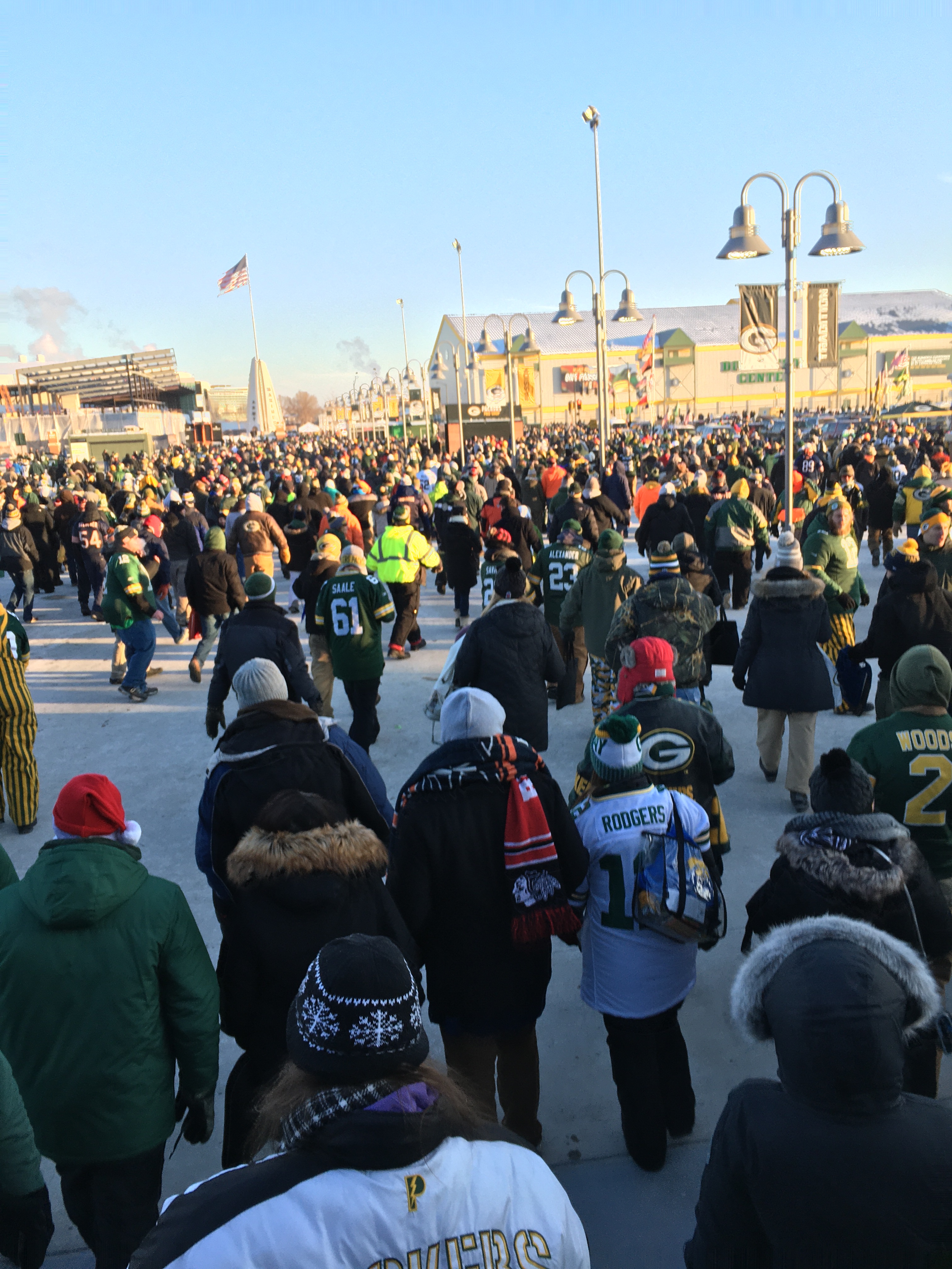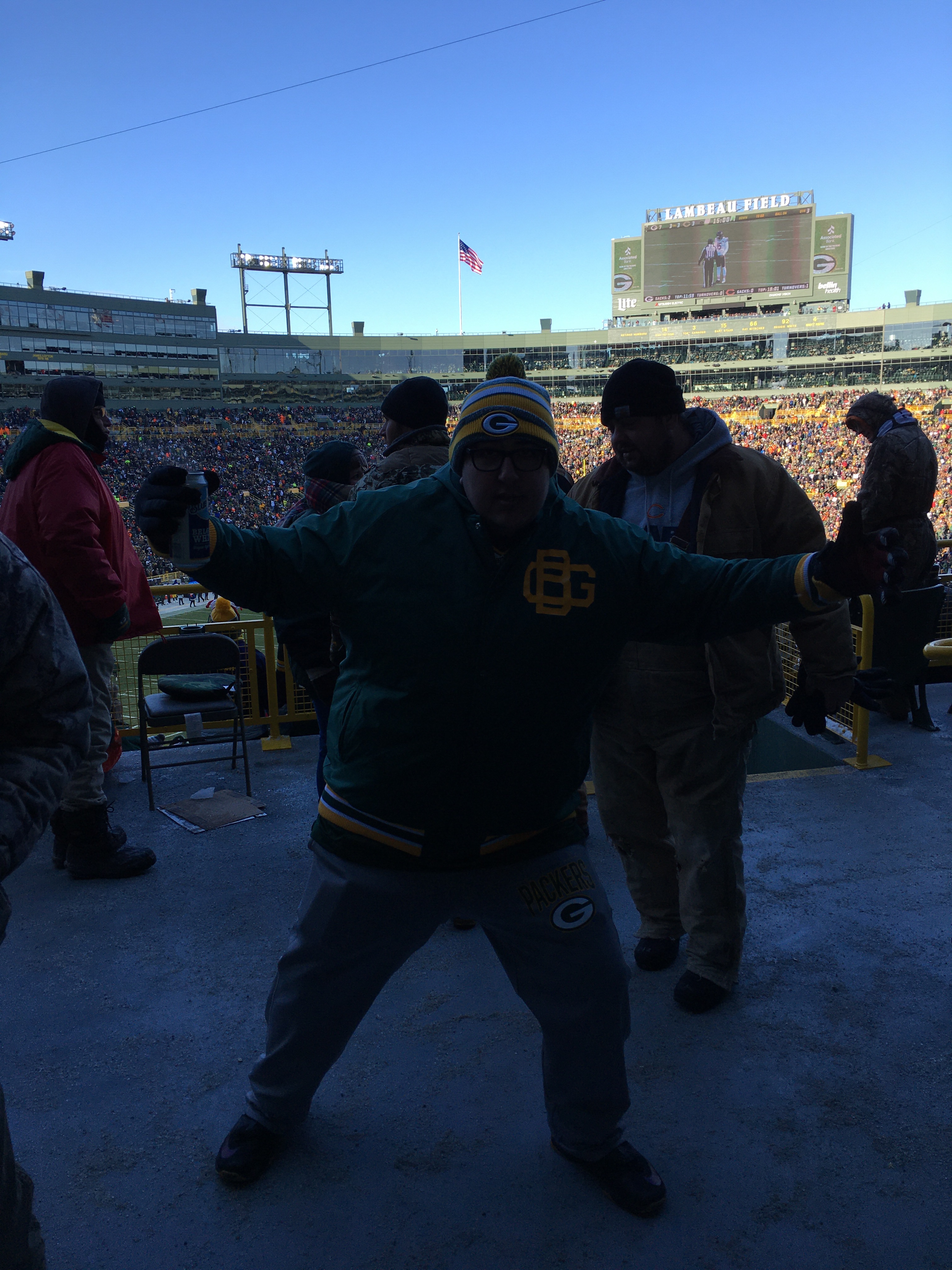 Now, you may ask, who would want to stand out in subfreezing temperatures to watch a bunch of sweaty, overgrown men pushing each other around? First of all, there’s more to football than that narrow perspective. As for your answer, it’s simple, Green Bay Packer fans. We revel in it, well not all of us, but quite a few love to brave the elements and create an absolutely hostile environment for opposing teams. Packer fans are actually famous for it, namely because of the 1967 NFC championship game known as the Ice bowl. During that historic game, the fans withstood temperatures of -15 degrees Fahrenheit. So, when I woke up Sunday morning and learned the high temperature would only be eighteen degrees, I couldn’t simply skip the game and waste my 100 dollars on pre-purchased tickets. That would be pure sacrilege. In Wisconsin, you’re born and raised a Packer fan, and bundling up to cheer on the Pack is practically a rite of passage.