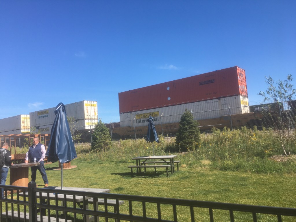 Like I said, I’m driving through an office building complex. It then yields to the most historic Industrial setting I’ve ever set eyes on, at least when it comes to micro-breweries. Long twin smoke stacks stretch towards the sky, as they rise from a genuine brick building. I shake my head, this is cooler than I could’ve ever imagined. It’s obvious that this is not some recreated structure, this is the real deal. Adding to the ambiance, a railyard serves as backdrop. I check out the procession of boxcars that are lined along the rusty rails. A grassy beer garden buzzes with chatter between the industrial building and the tracks.