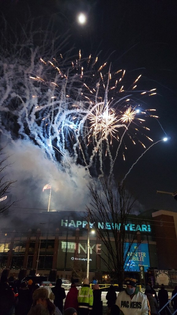 However, when there’s a minute left, we walk around the DJ stand. Here, from this spot, I can see Lambeau Field. On this historic stadium’s facade, time ticks down via a giant projection. And after I shout 2020’s waning seconds into the frozen night, fireworks, rocketing from the venue, mark 2021’s arrival.
