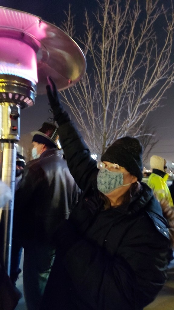 Even if I had bundled up, the chill has set in. So, we locate some warmly radiant heaters nearby. There’s actually quite a few scattered about on the concrete, and much of the crowd is congregated around them….including Heidi and myself.