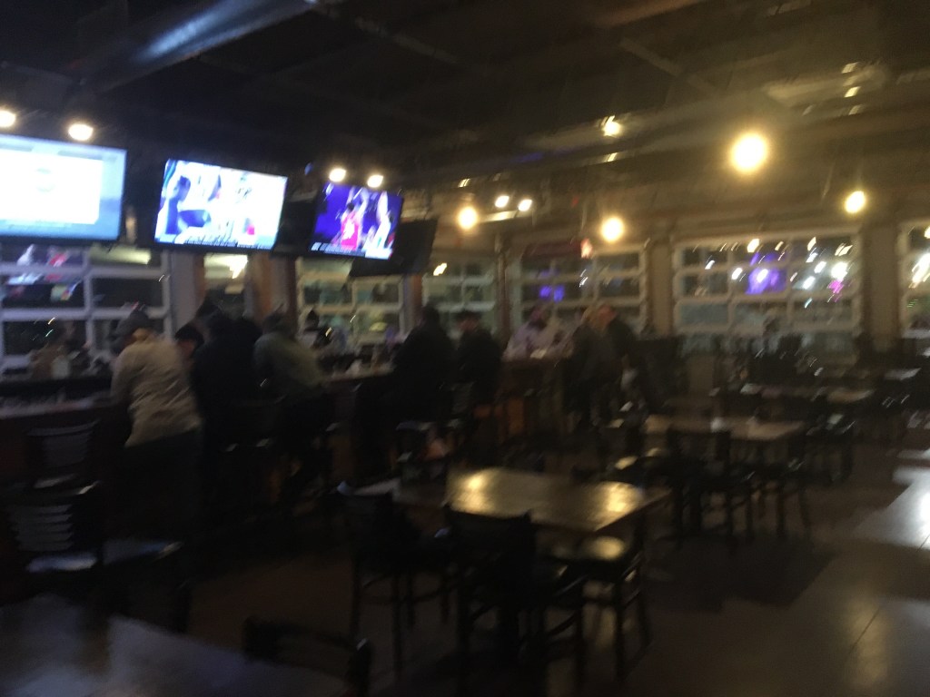 You may point to that reason and say, “Aha! That’s why you didn’t like it Chris!” Truth be told, there were tons of other reasons. When I scanned my surroundings, and I couldn’t put my finger on it, but the decor seemed a bit disjointed. There was a stained wood wall in one portion, an enormous and obnoxious energy drink banner above it, a mass of metal framing along a metal roof overhead and curious looking pendant lighting strung from the rudimentary ceiling. I don’t know…Maybe it’s a new, hip thing, but I just wasn’t buying it. There were plenty of TVs showing sporting events, and that’s cool I guess.