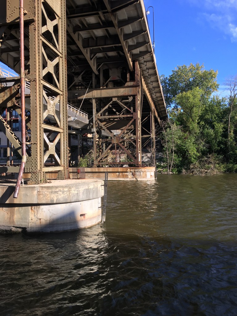You can sit on chairs facing the Milwaukee River and enjoy a view of a Bridge,