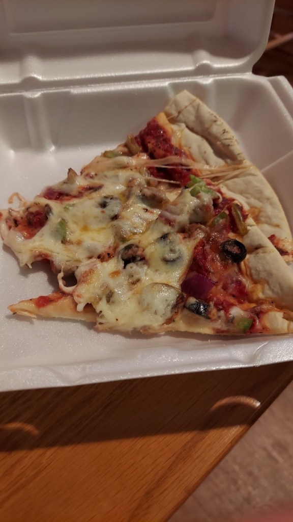 When the final tally was rung, keeping in mind a well deserved tip, our bill was around fifty dollars. The pizza was worth it. Between the two of us, considering we embarked on a fully loaded 14” pizza, this is what was left.