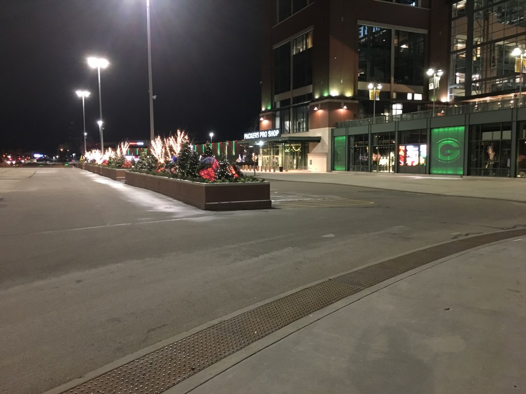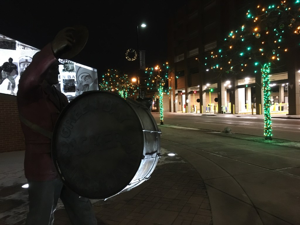 While gallivanting downtown, we discovered the Walk of Legends, a monument honoring past Packer greats, festively lit in our favorite team’s colors