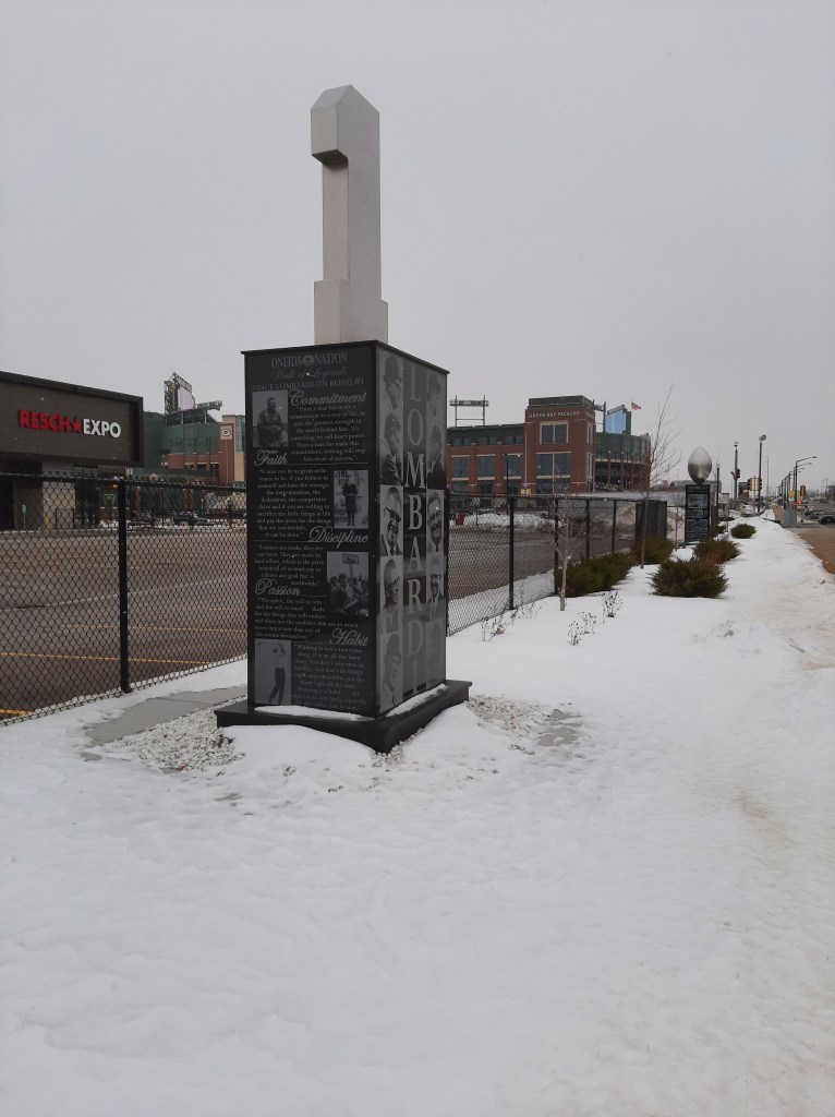 One could stroll east, away from the setting sun, along the mile long ‘Walk of Legends’, and discover momunents honoring Packers of the past.