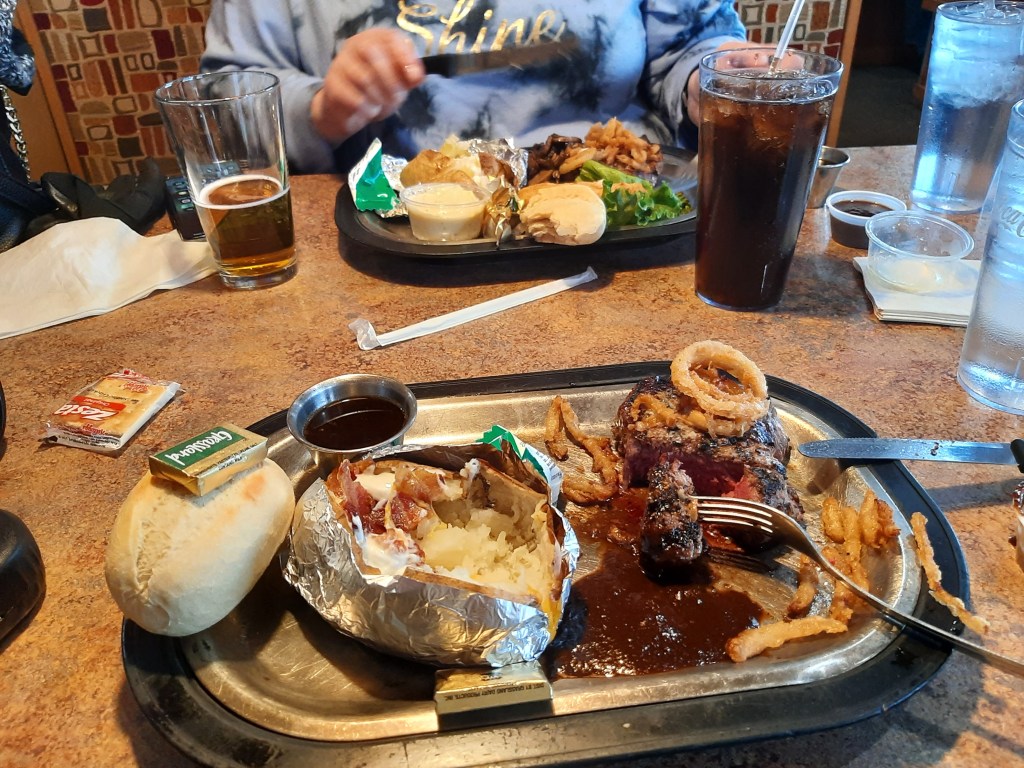 Our check registered around sixty dollars, plus a tip. Considering we both had tenderloin steaks with sides, and I can’t forget a bowl of sumptuously spiced chili, the tally was reasonable. And more importantly, with the fairly frigid temps, we had warm food delightfully simmering in our bellies.