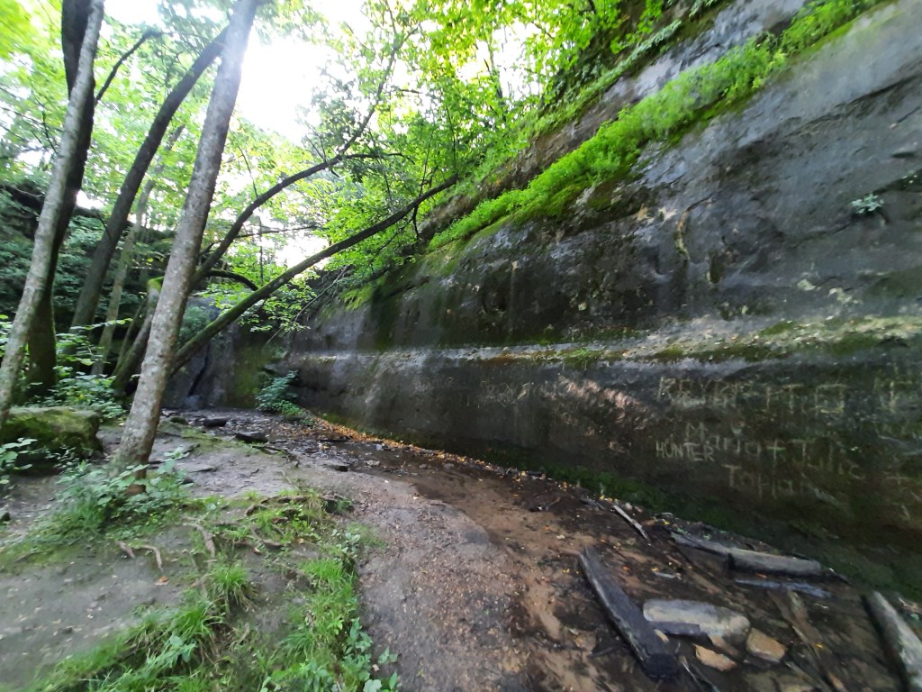 We continued further, striding along a trickling stream, which flowed across deadwood and moss covered rocks, and ran in between steep rock walls.