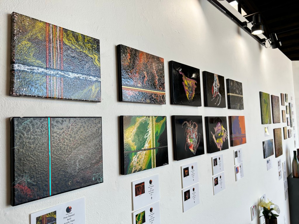 As I wrap my short post up, I’ll mention that both Elements: Wind and Pour it On are on display until October 29th. Art can be purchased on site and will be available the first week of November.