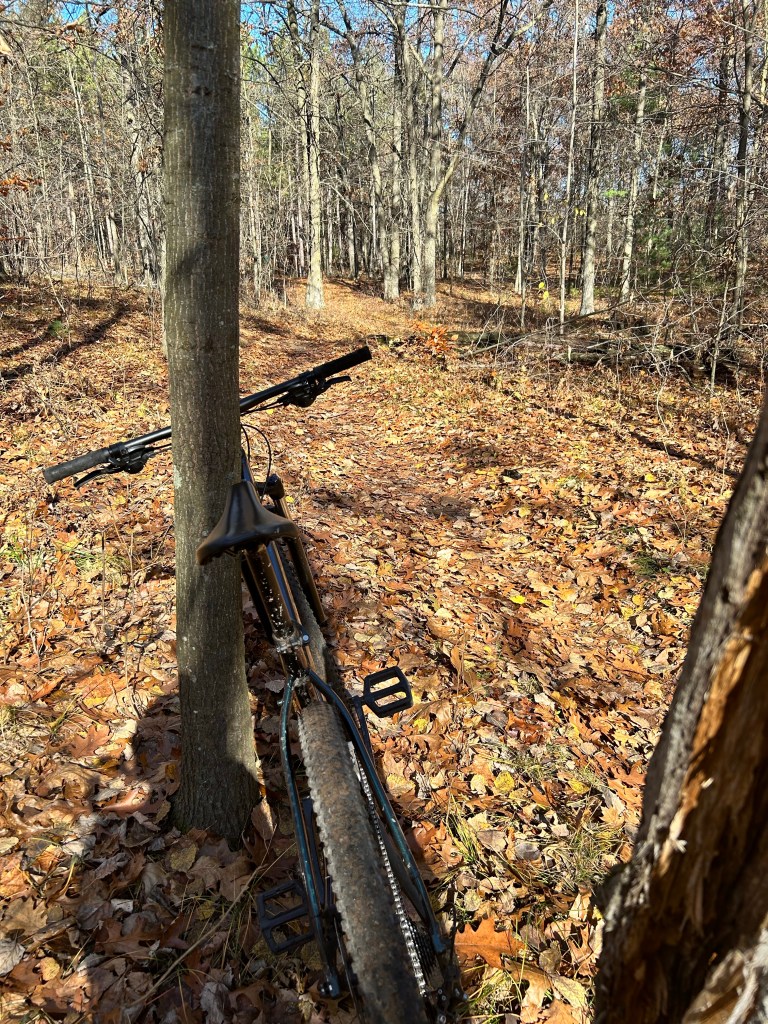 The obscured trail, which is tricky to navigate, is best found by observing the empty trees. Finding the open space, especially on a single track, is quite difficult.